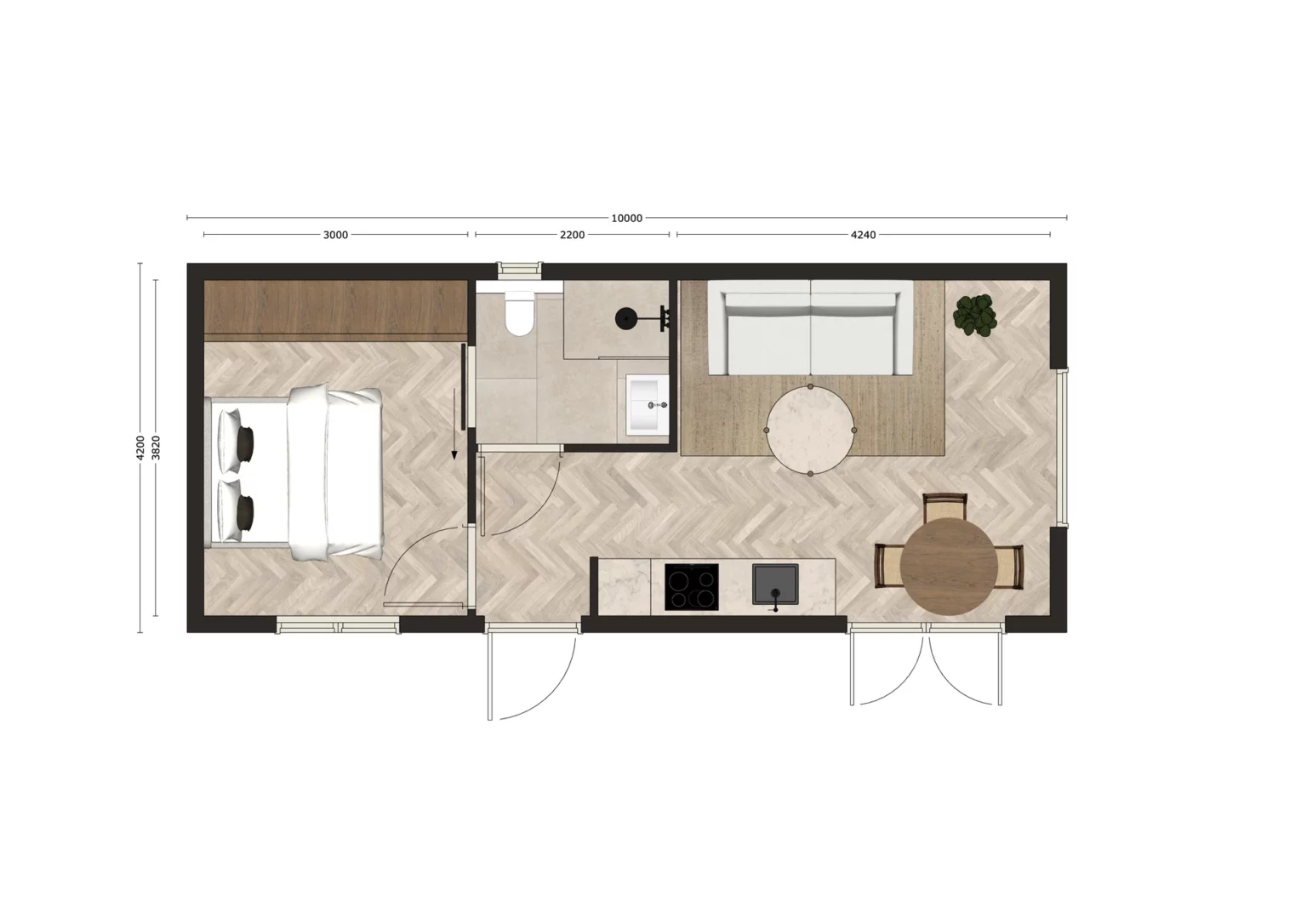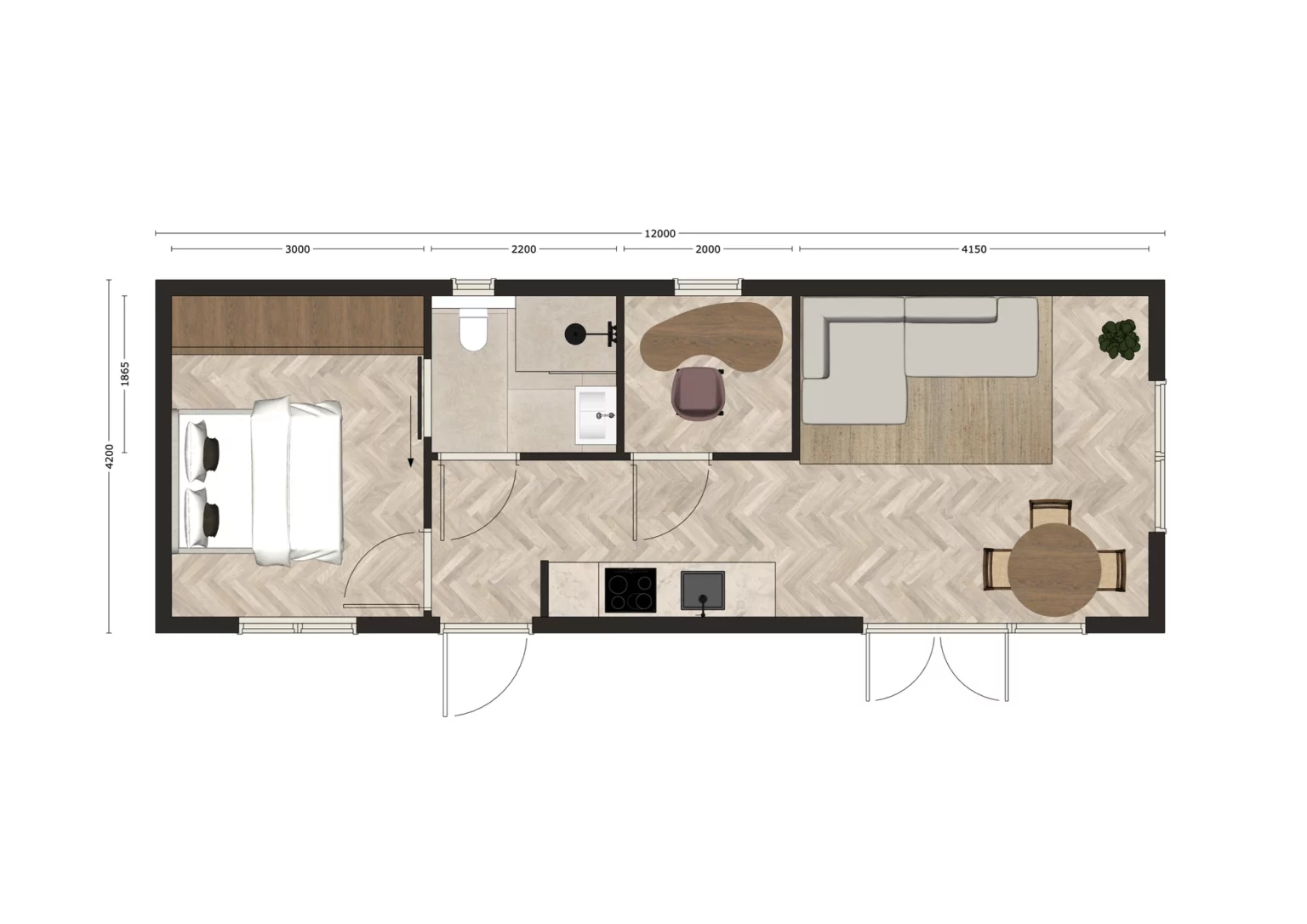Een opvallend rechthoekig model mantelzorgwoning met unieke split-level dakconstructie. Door een praktische indeling kan de woning bescheiden blijven in formaat.