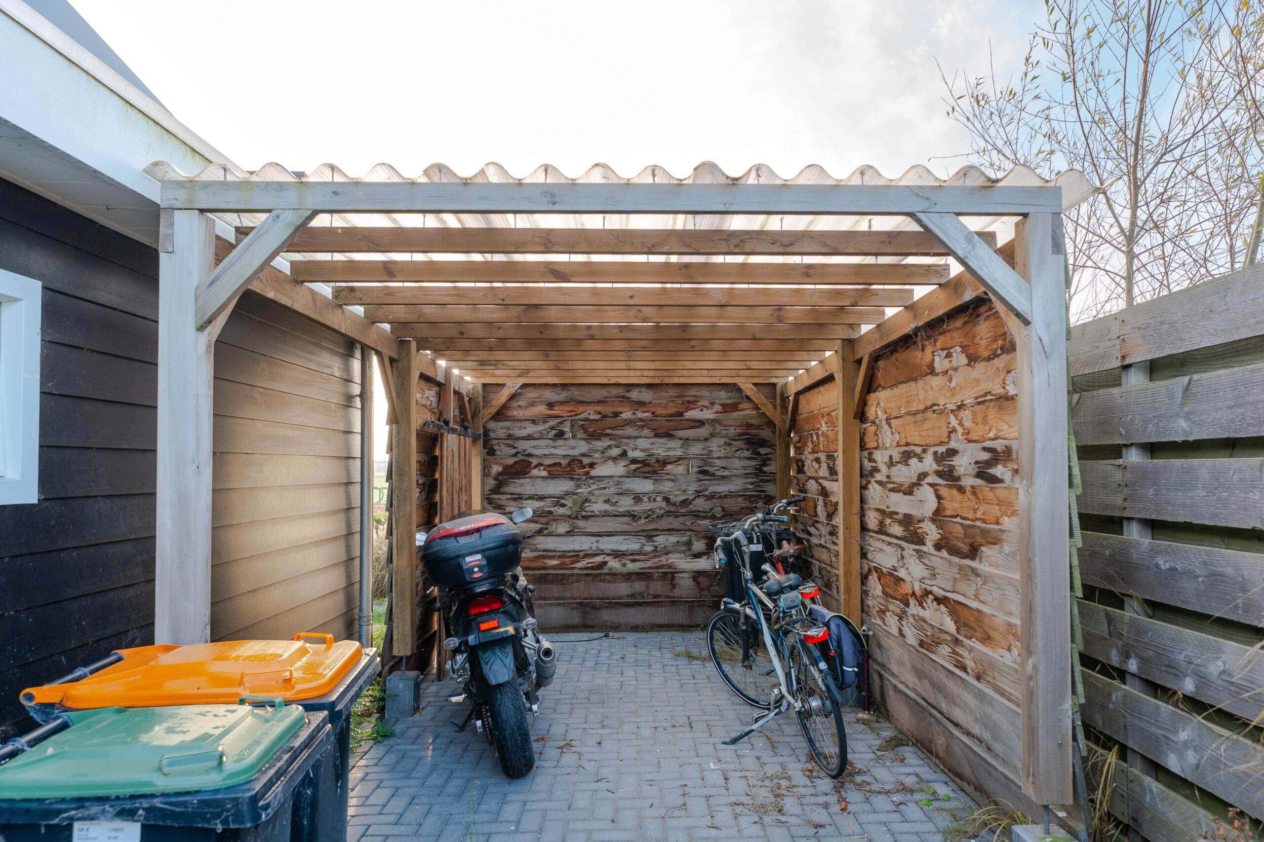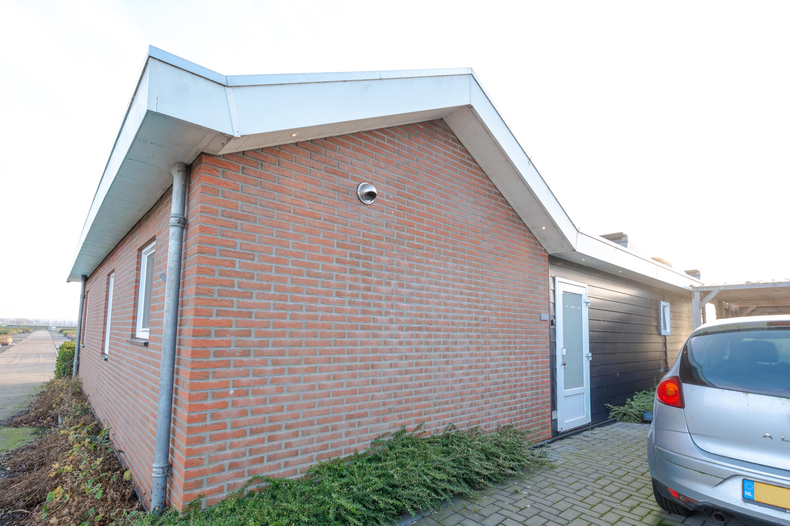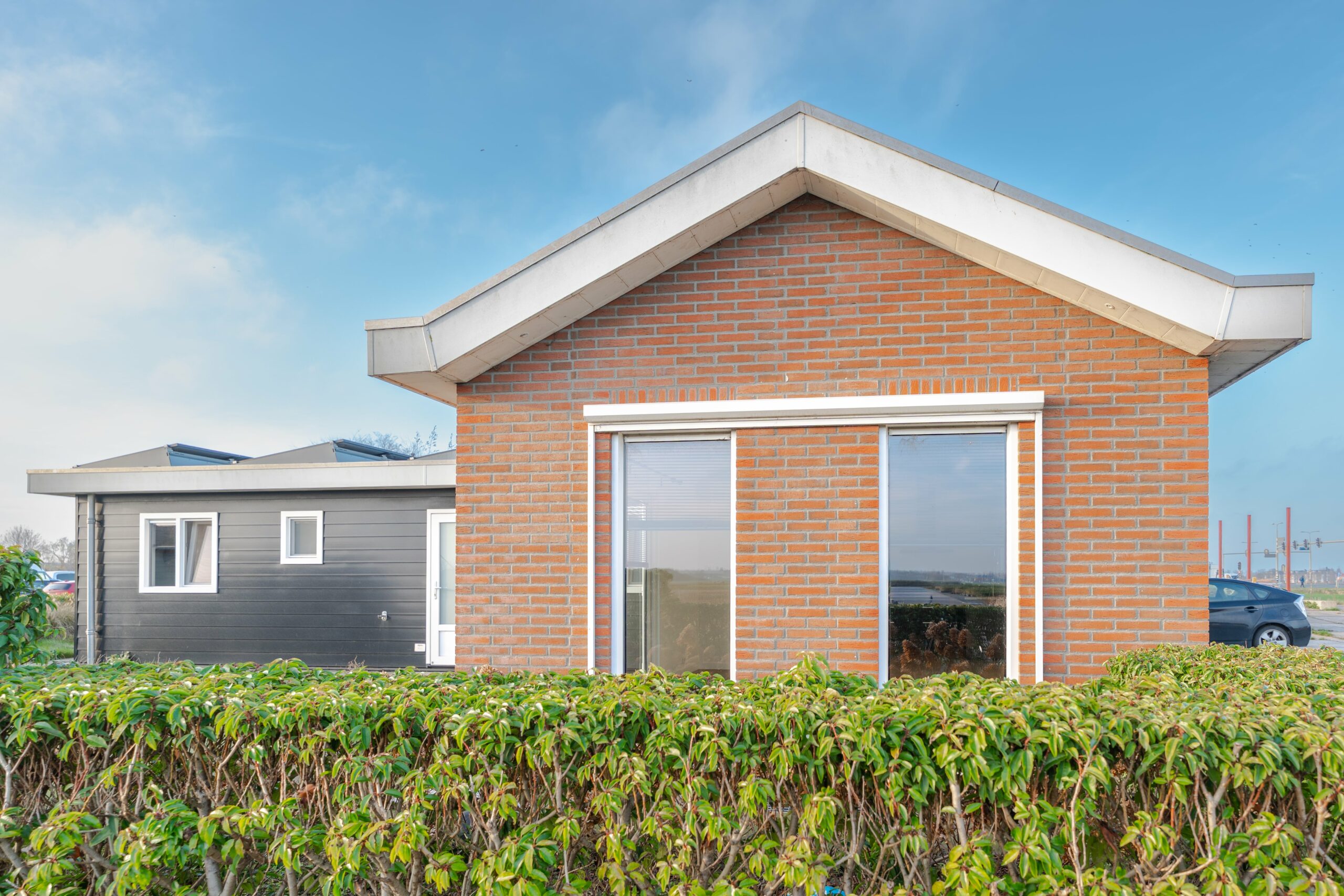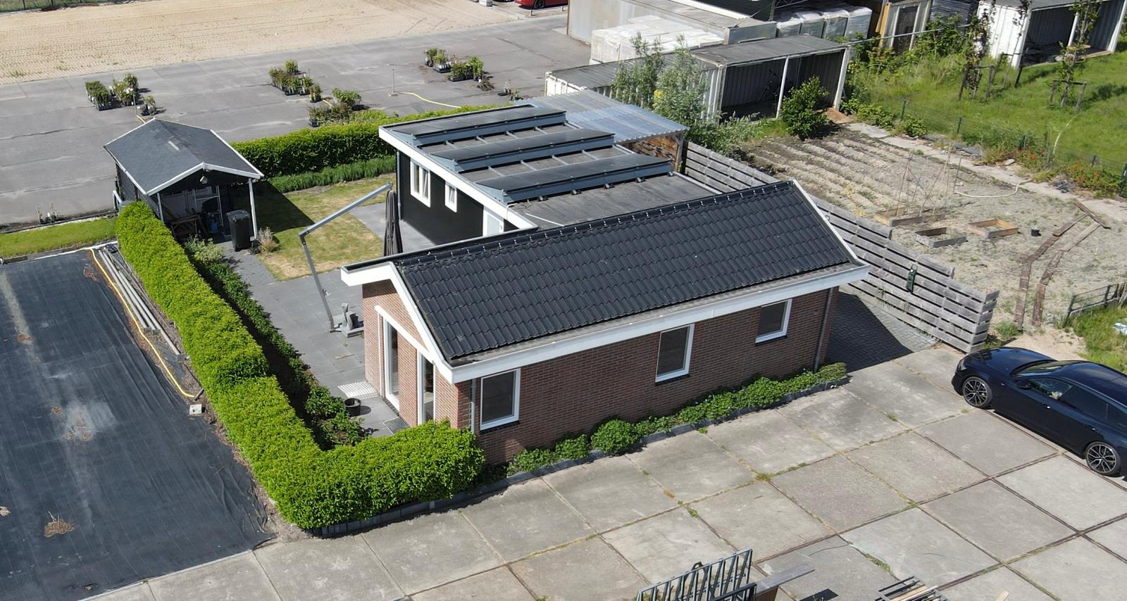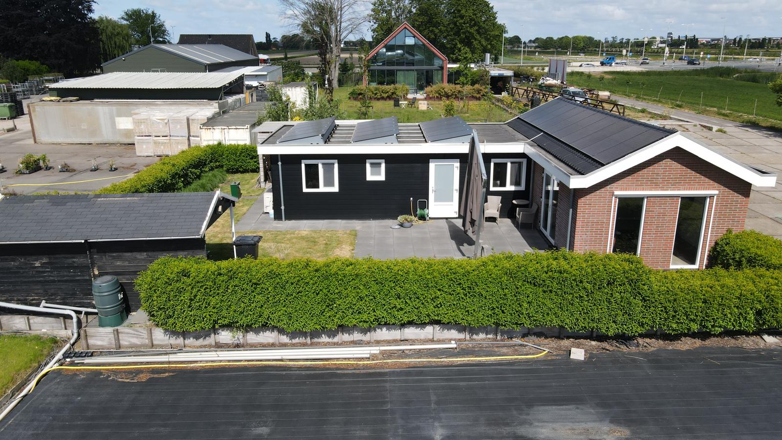 • Het deel met plat dak is afgewerkt met zwarte kunststof rabatdelen