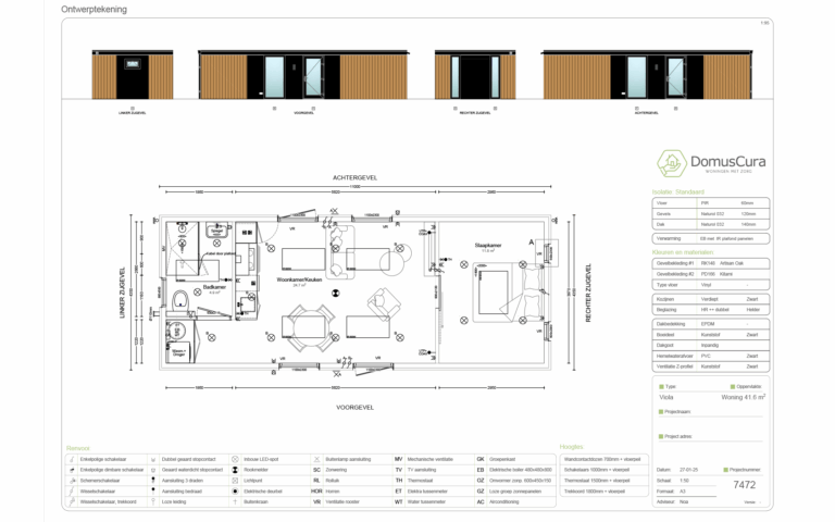De Viola is meer dan een mantelzorgwoning; het is een compleet huis dat aan al uw behoeften voldoet. Met een ruime, rolstoelvriendelijke indeling en veel natuurlijk licht, biedt de Viola een moderne en uitnodigende sfeer. De woning is compleet met keuken en badkamer en kan tegen meerprijs worden uitgebreid met een tuinkamer (11 m²). Indeling